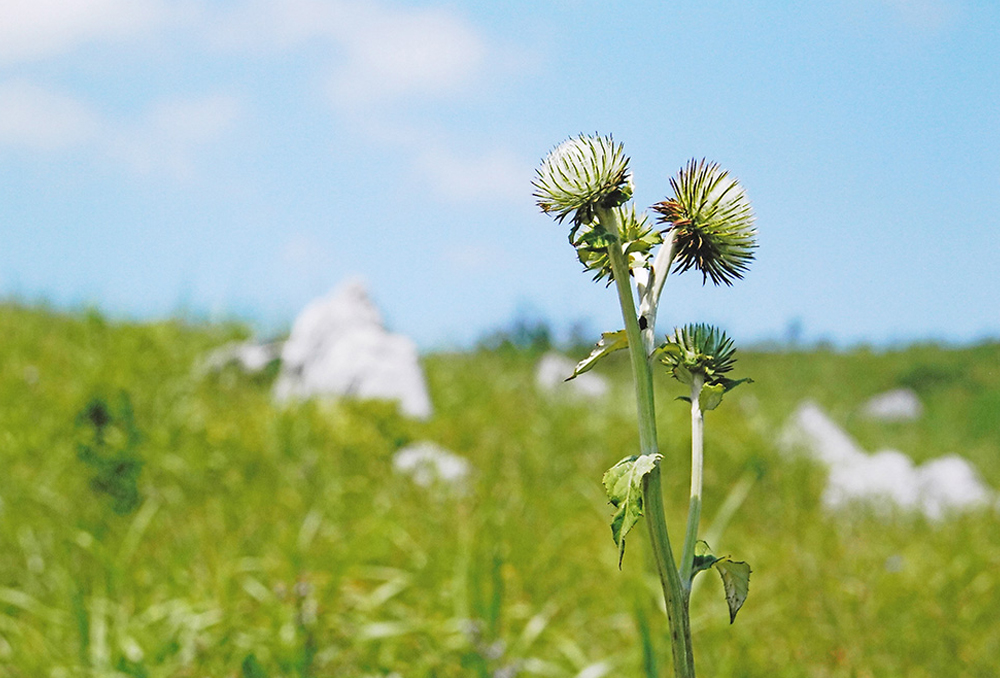 | 特徴 | 和名「葉場山火口(ハバヤマボクチ)」。綿毛を取り出して火起こしに使ったことから名がついたと言われる。 |