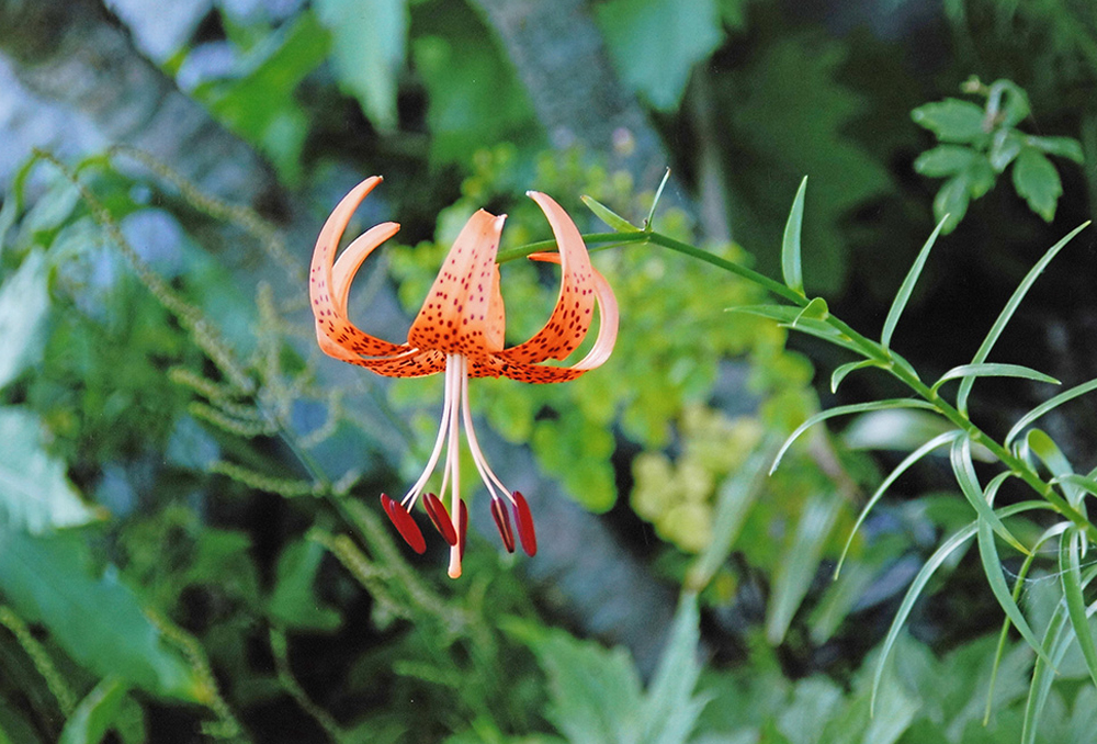 | 特徴 | 花被片は6枚あり、上部が反り返る。花被片の内側には黒紫色の斑がある。 |