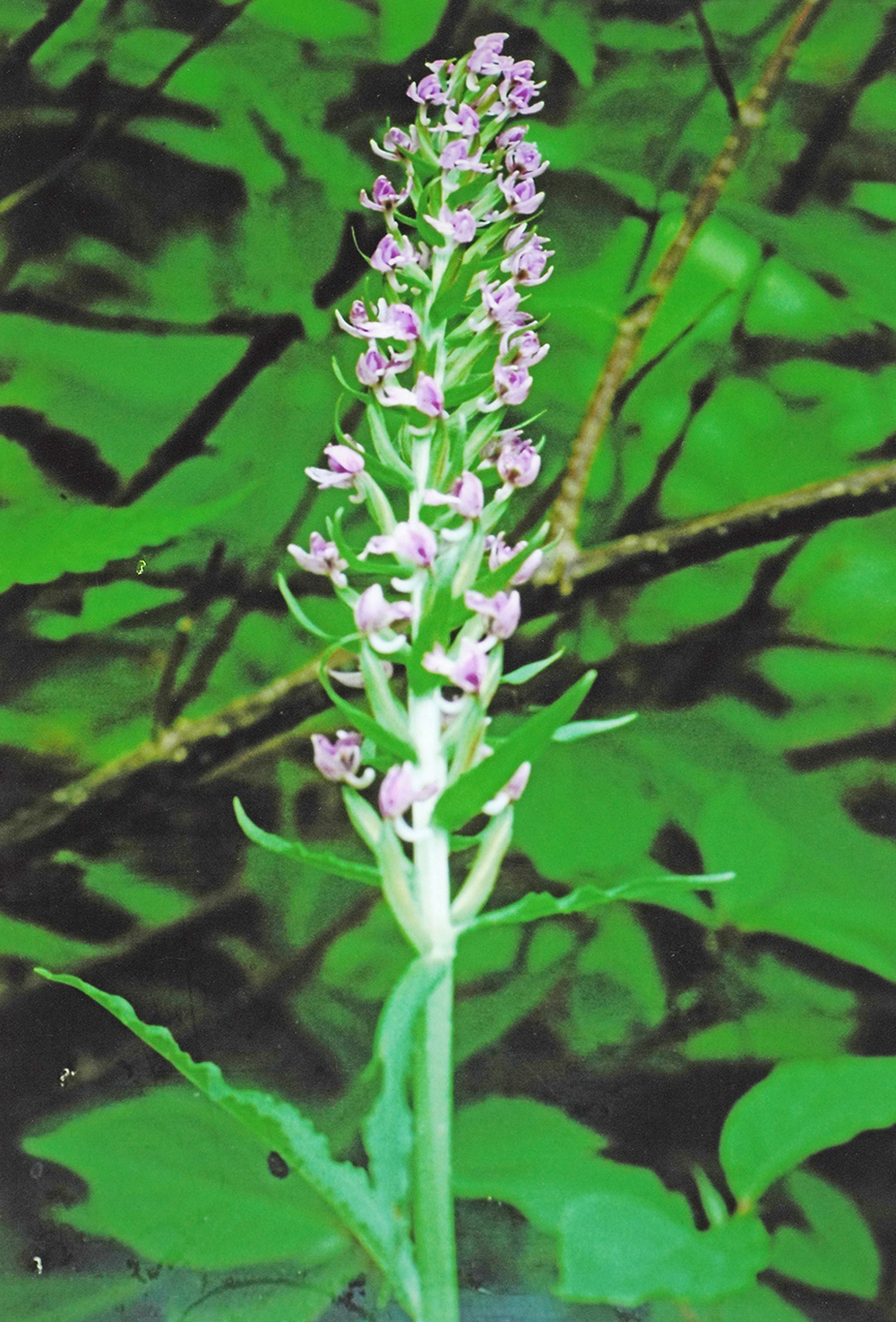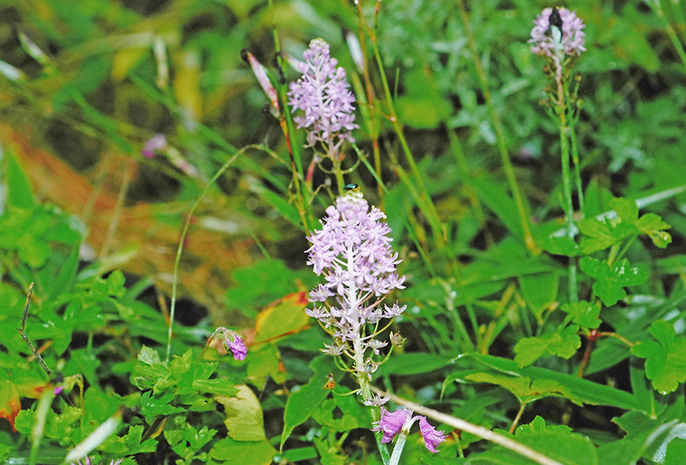 | 特徴 | 葉は5~10枚。葉面にしわがあり、花は淡紅紫色で穂状になっている。 |